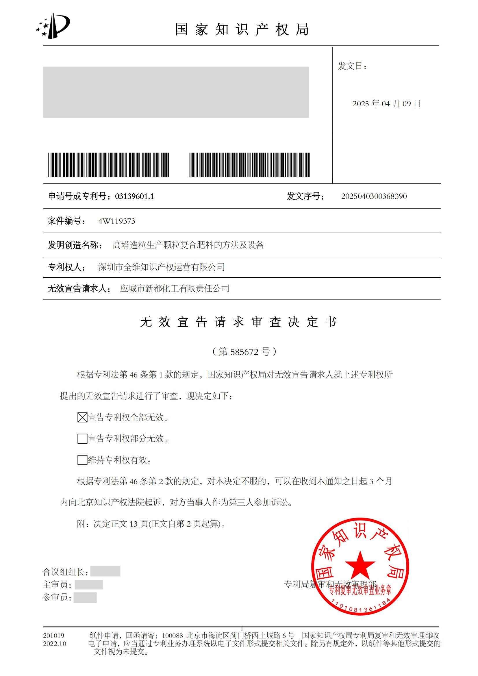 據(jù)此,國(guó)家知識(shí)產(chǎn)權(quán)局于2025年4月9日正式發(fā)出第585672號(hào)無效宣告請(qǐng)求審查決定書,宣告專利號(hào)為 03139601.1 的“高塔造粒生產(chǎn)顆粒復(fù)合肥料的方法及設(shè)備”發(fā)明專利權(quán)全部無效。