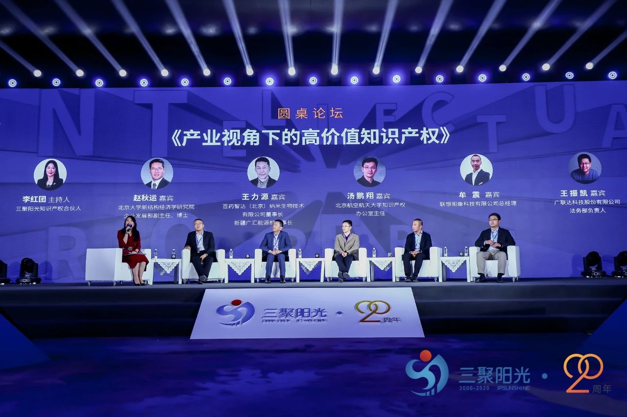 ? 10月21日,由三聚陽光知識產(chǎn)權(quán)集團主辦的“高價值知識產(chǎn)權(quán)與商業(yè)增長論壇暨三聚陽光二十周年大會”在北京金隅喜來登酒店圓滿舉辦,論壇包括主題演講和圓桌討論環(huán)節(jié),現(xiàn)場氣氛活躍,各位行業(yè)大咖暢快而談,產(chǎn)生了深度的思維碰撞。中國知識產(chǎn)權(quán)研究會理事長、國家知識產(chǎn)權(quán)局原局長田力普,北京市知識產(chǎn)權(quán)局局長、黨組書記楊東起,江蘇省科技創(chuàng)新協(xié)會名譽會長、江蘇省知識產(chǎn)權(quán)局原局長朱宇,世界知識產(chǎn)權(quán)組織中國辦事處高級顧問吳凱,國際保護知識產(chǎn)權(quán)協(xié)會中國分會秘書長李毅,北京市專利代理師協(xié)會秘書長高永懿,北大新結(jié)構(gòu)經(jīng)濟學研究院學術(shù)副院長王勇教授,中國政法大學民商經(jīng)濟法學院知識產(chǎn)權(quán)法研究所所長馮曉青教授,中關(guān)村天使百人會理事長喬遷,中原內(nèi)配集團股份有限公司監(jiān)事會主席薛建軍,蒙牛乳業(yè)集團股份有限公司副總裁溫永平等領(lǐng)導、專家學者、知名企業(yè)家和投資人以及服務(wù)機構(gòu)同仁受邀出席了本次論壇。