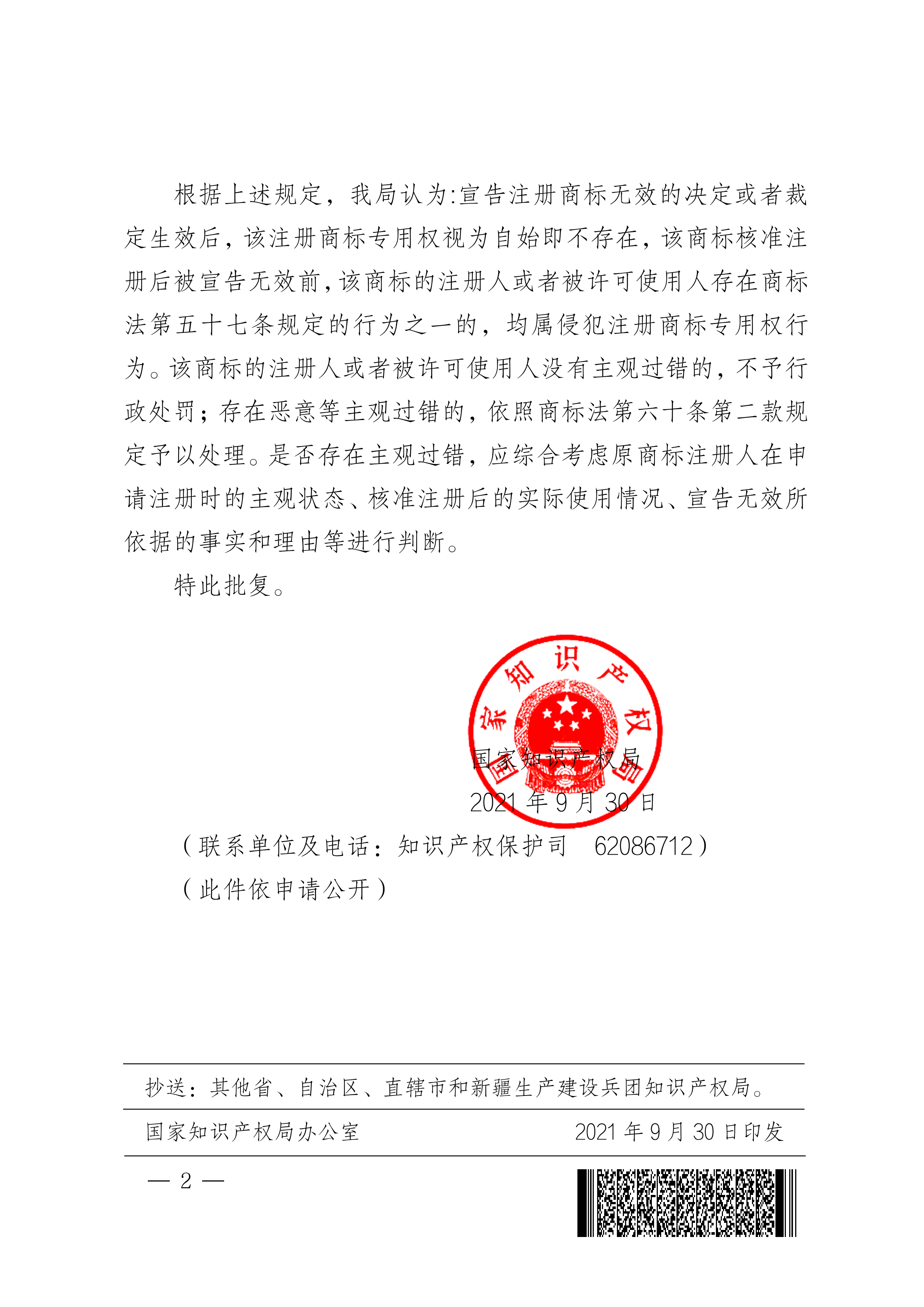 日前,國(guó)家知識(shí)產(chǎn)權(quán)局政府信息公開(kāi)辦公室依照相關(guān)規(guī)定作出《政府信息公開(kāi)答復(fù)書(shū)》,同時(shí)隨附《國(guó)家知識(shí)產(chǎn)權(quán)局關(guān)于商標(biāo)注冊(cè)后被宣告無(wú)效前侵犯他人商標(biāo)權(quán)是否予以行政處罰的批復(fù)》(國(guó)知發(fā)保函字〔2021〕155號(hào))反饋我司。