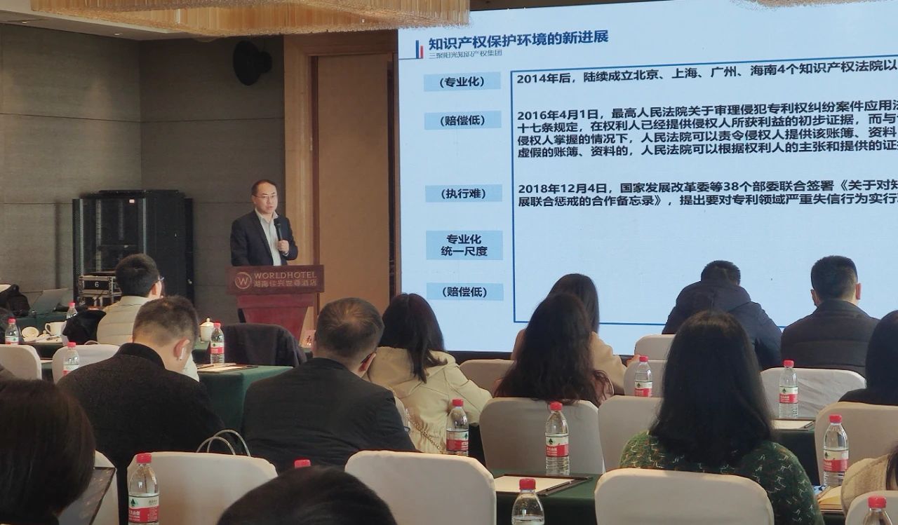 日前,由湖南省知識產(chǎn)權(quán)協(xié)會主辦、三聚陽光長沙公司承辦的“企業(yè)國內(nèi)外貿(mào)易中專利訴訟與應(yīng)對策略研討會”成功舉辦。國家知識產(chǎn)權(quán)局原局長、中國知識產(chǎn)權(quán)研究會原理事長田力普,湖南省知識產(chǎn)權(quán)協(xié)會常務(wù)副理事長、湖南省知識產(chǎn)權(quán)局原副局長劉躍紅,三聚陽光董事長張杰受邀出席活動。三聚陽光總裁張建綱、北京易聚律師事務(wù)所主任律師周美華作主題分享。三聚陽光副總裁朱正強主持研討會。
