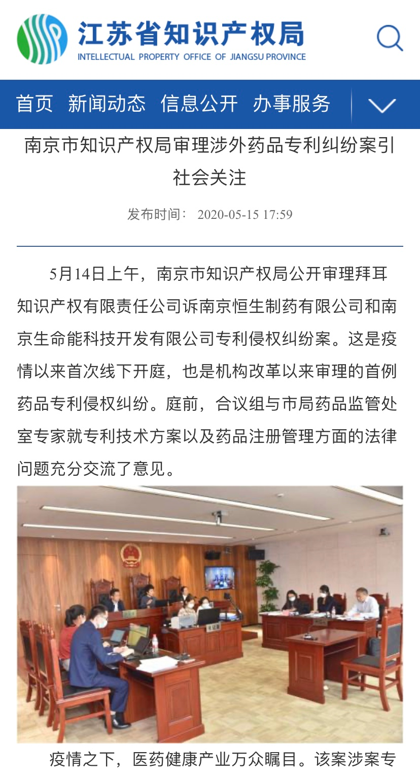 自疫情發(fā)生以來,醫(yī)藥健康產(chǎn)業(yè)的動態(tài)就一直備受矚目。而本案作為南京市知識產(chǎn)權(quán)局疫情后線下開庭的第一案,到庭審現(xiàn)場旁聽的律師、專利代理師、醫(yī)藥大學(xué)生、藥業(yè)企業(yè)代表等達(dá)四十多人。庭審結(jié)束后,江蘇省知識產(chǎn)權(quán)局在其網(wǎng)站對案件情況進行了報道。
