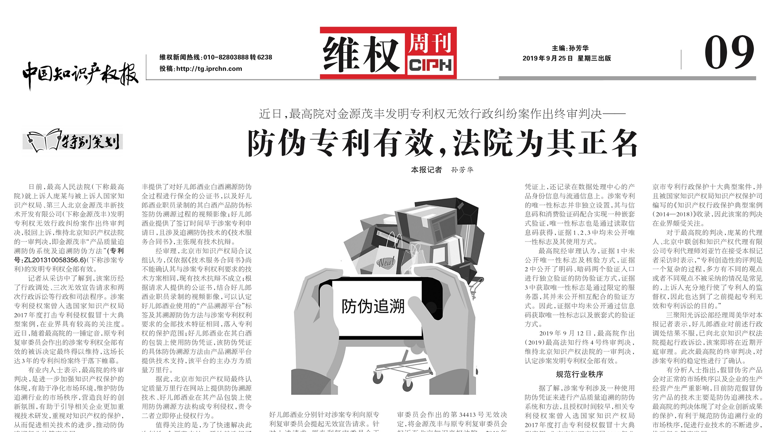 三聚陽光旗下易聚律所主任律師周美華接受知識產權報記者采訪時表示,好兒郎酒業(yè)對前述行政調處結果不服,已向北京知識產權法院提起行政訴訟,該案即將在近期開庭審理。此次最高院的終審判決,對涉案專利的穩(wěn)定性進行了確認。假冒偽劣產品會對正常的市場秩序以及企業(yè)的生產經營產生嚴重影響,目前防范假冒偽劣產品的技術主要是防偽追溯技術。最高法的判決體現了對企業(yè)創(chuàng)新成果的保護,有利于規(guī)范防偽追溯行業(yè)的市場秩序,促進行業(yè)技術的不斷進步,推動行業(yè)健康發(fā)展。